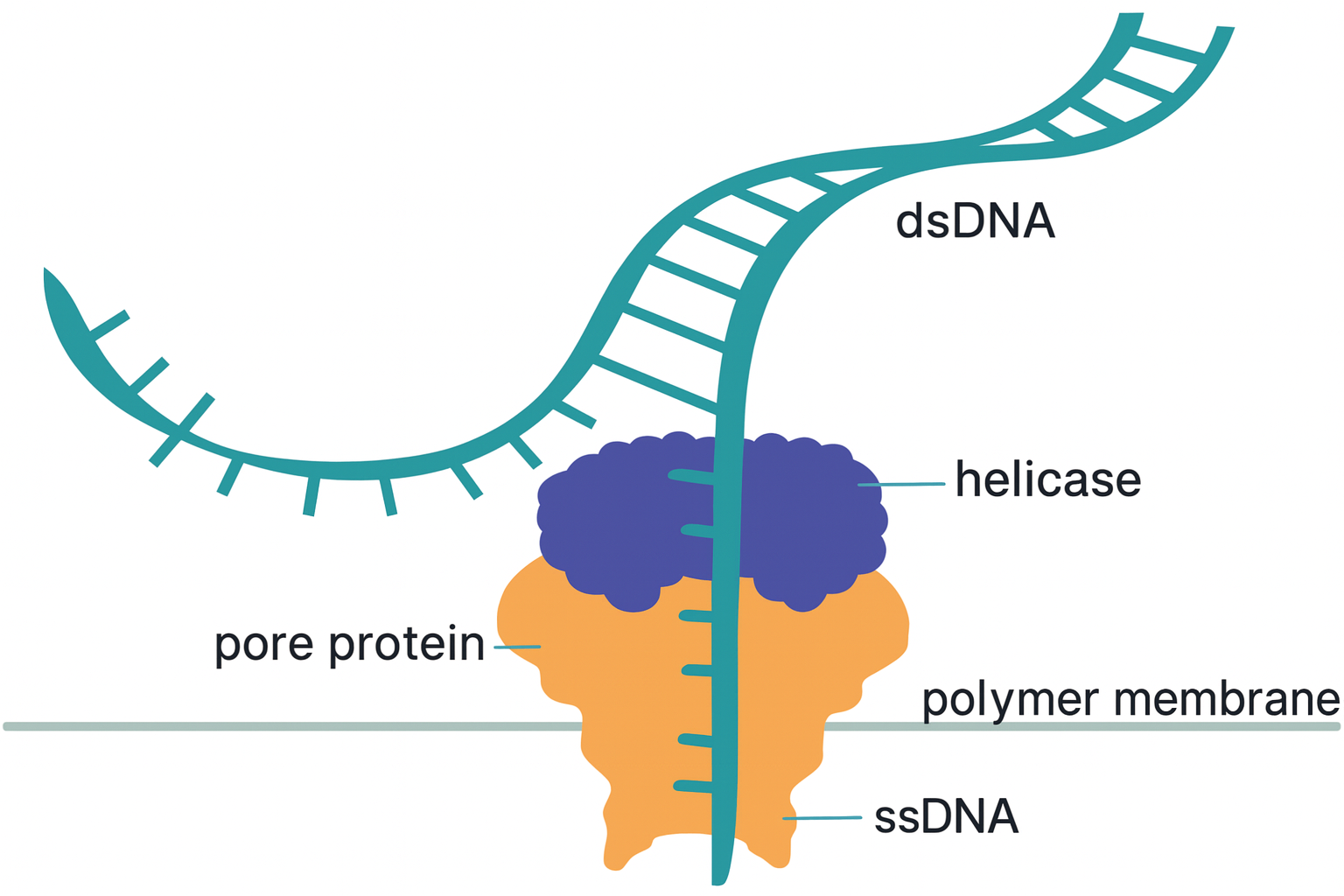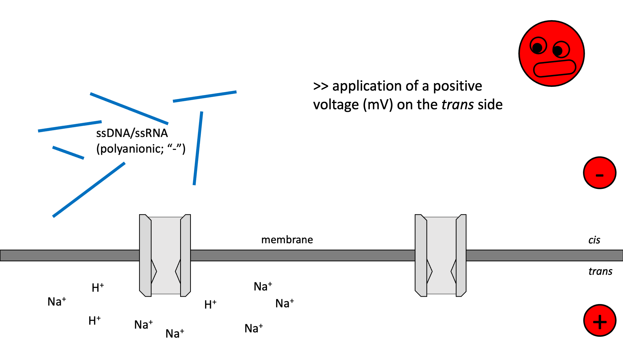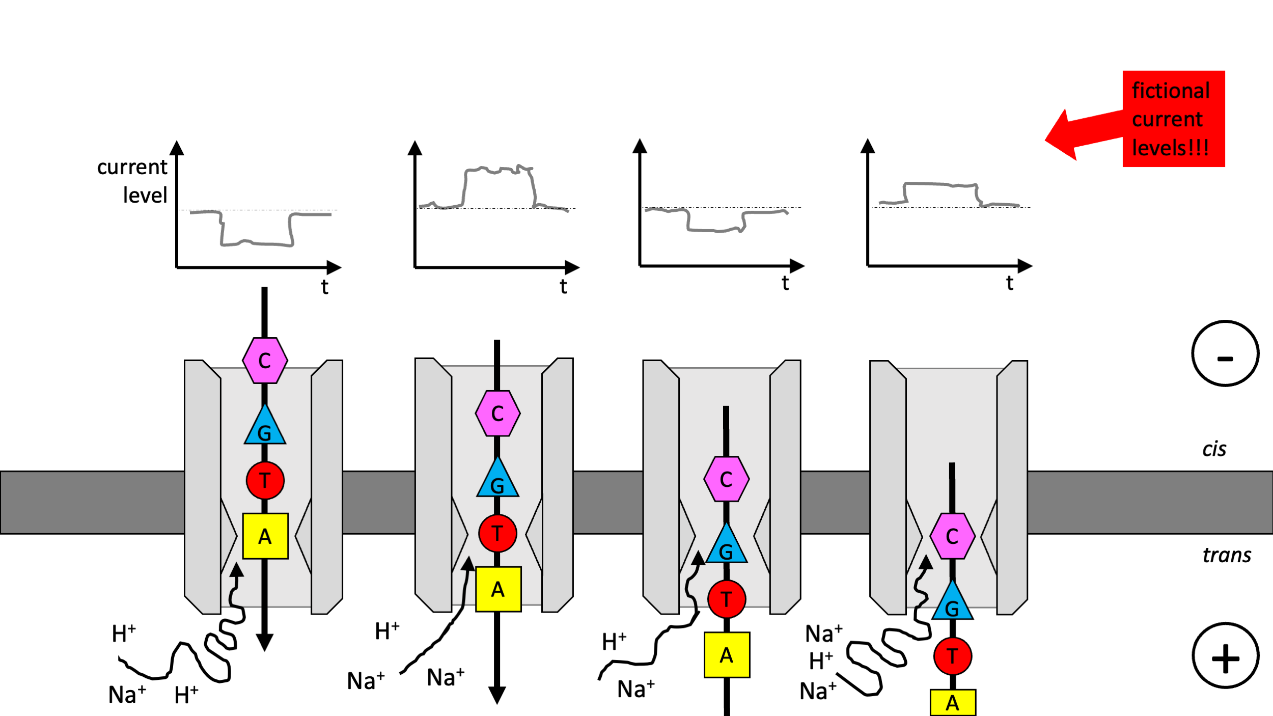 Idea: Push DNA through a small gap (pore) in a membrane and detect each nucleotide as it passes by.